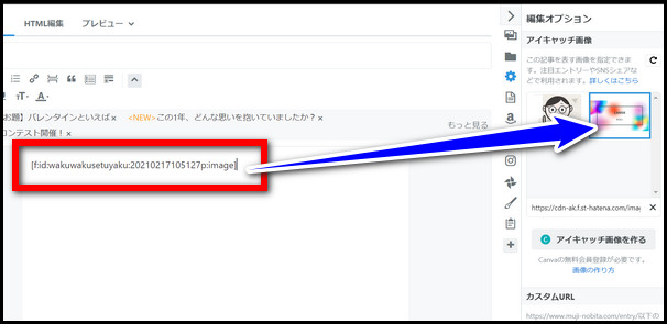 作成したアイキャッチ画像をダウンロードをして、はてなブログアップロードするので【1】で紹介したやり方よりも手間がかかります。