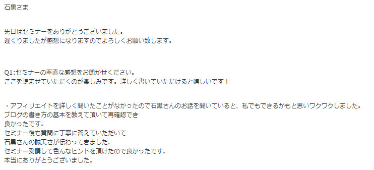 ・アフィリエイトを詳しく聞いたことがなかったので石黒さんのお話を聞いていると、私でもできるかもと思いワクワクしました。